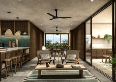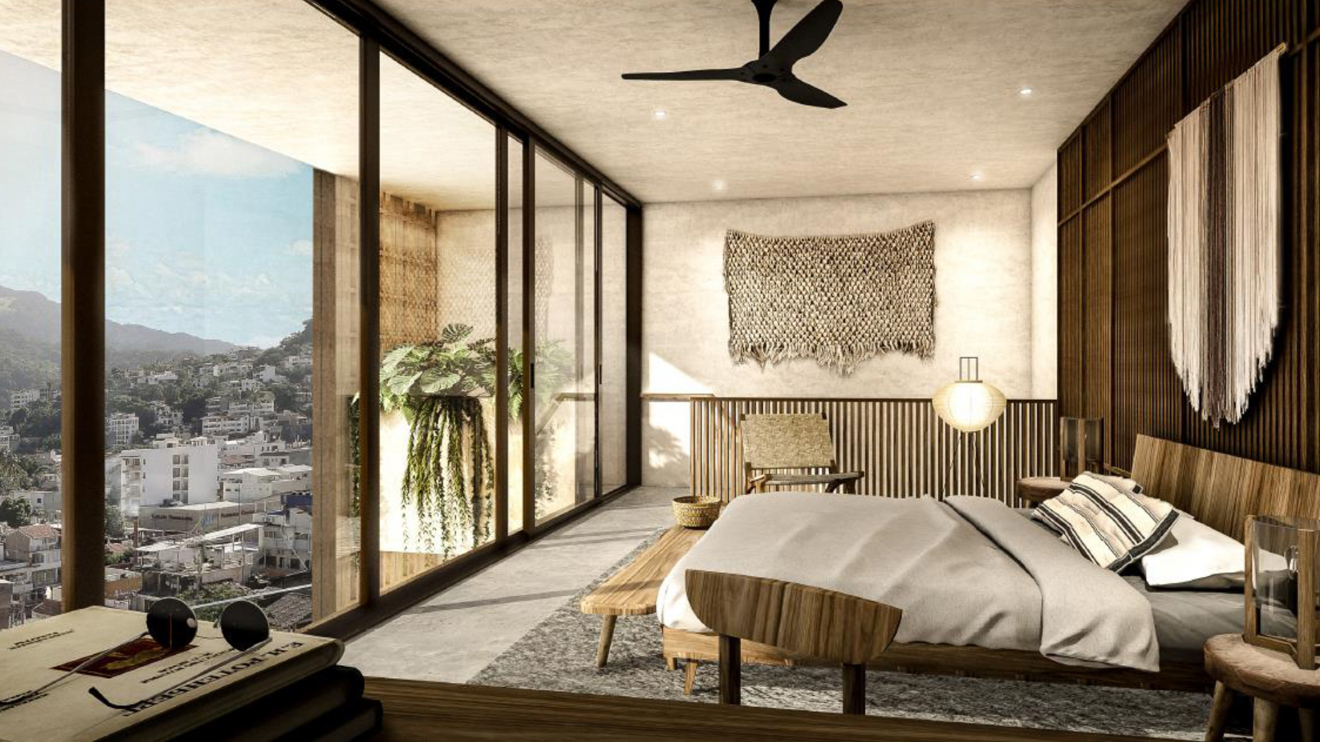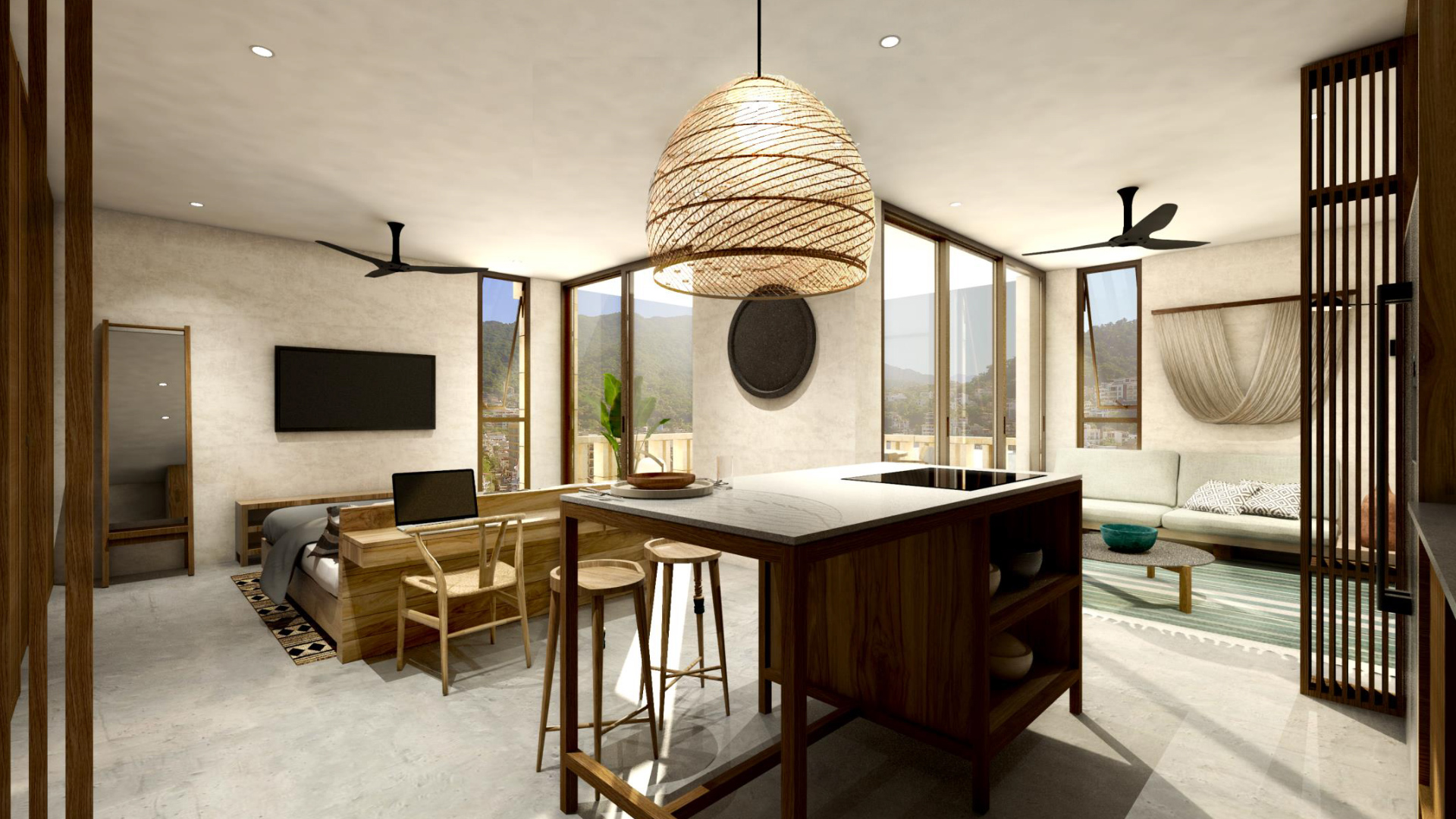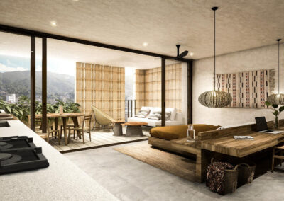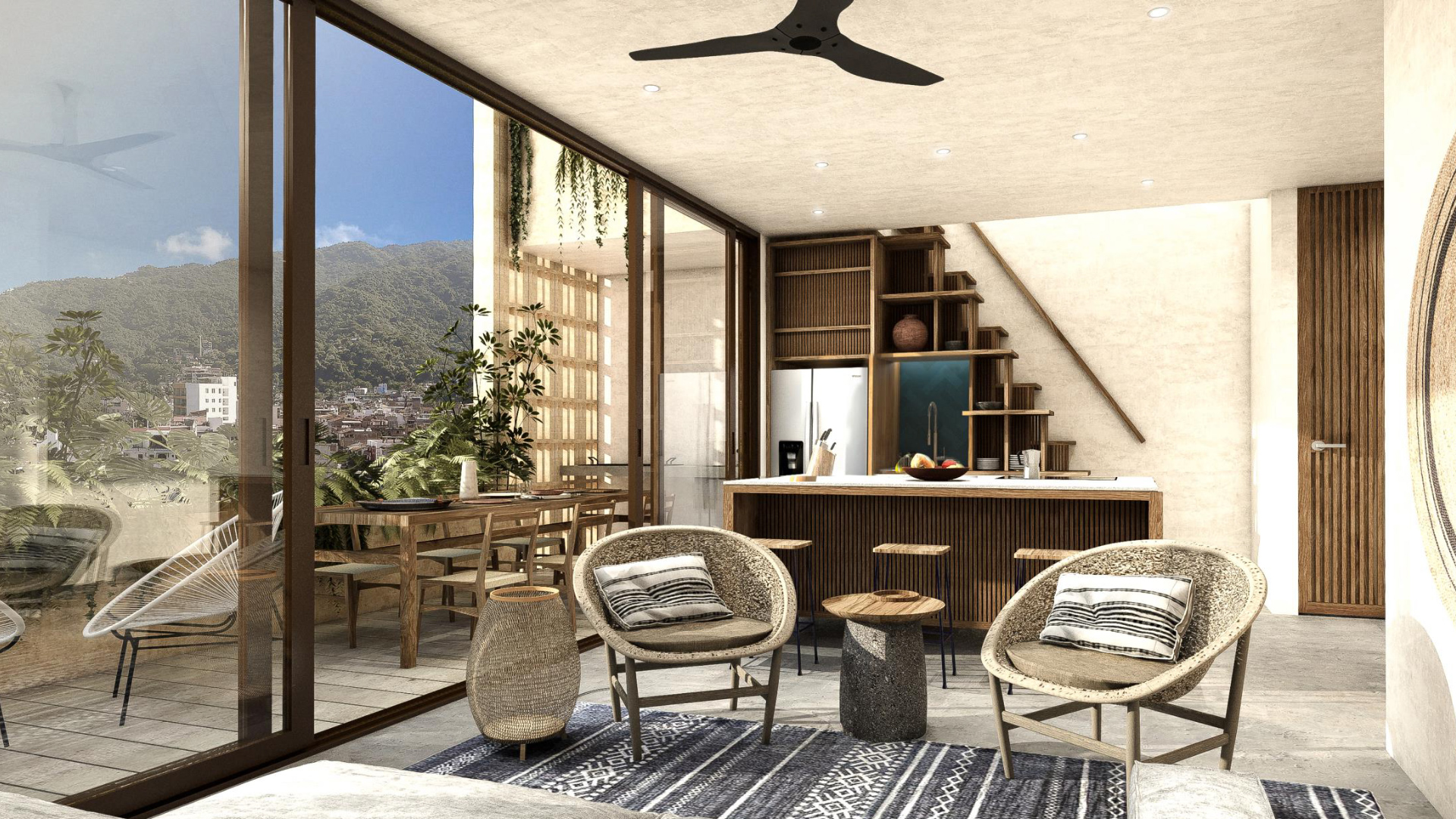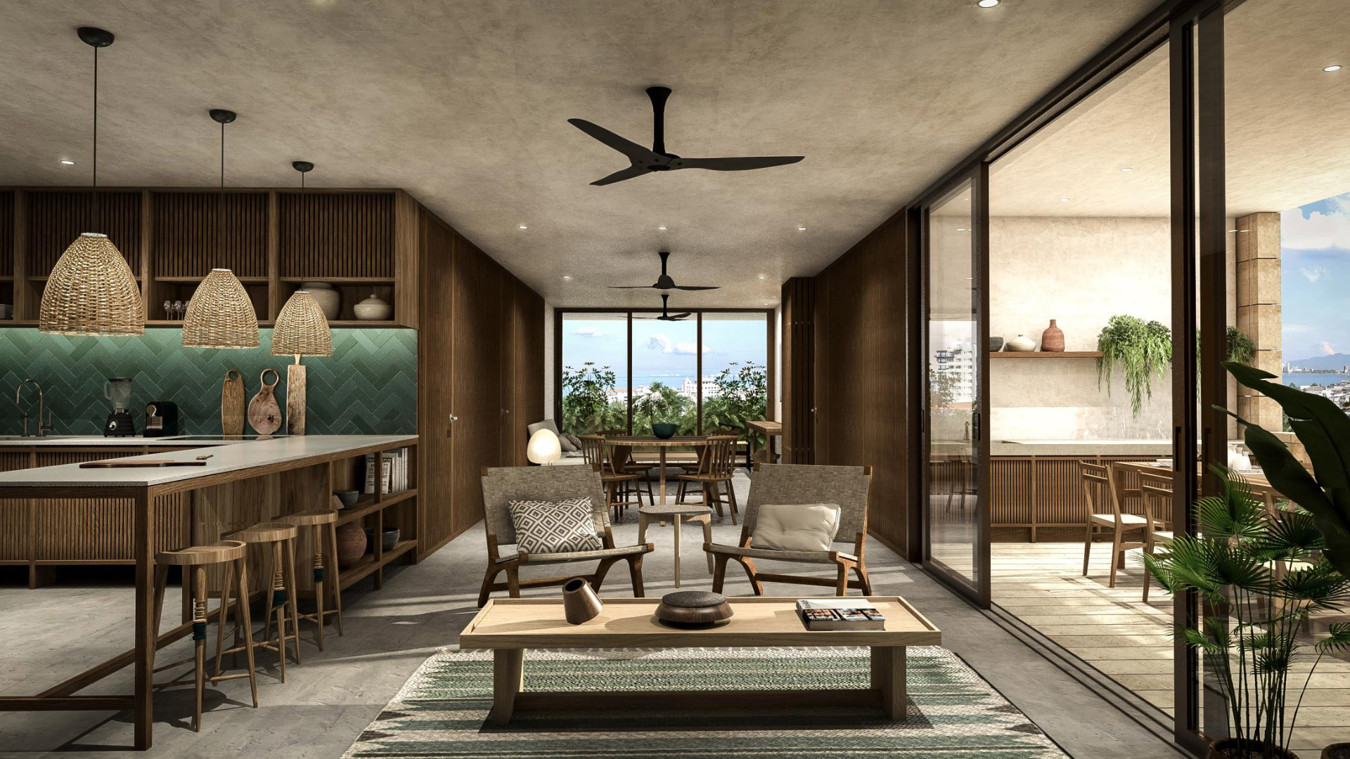 Ofrenda emplea un diseño orgánico mientras explota colores y materiales naturales para crear una experiencia de vida única. Los acabados crudos, el concreto pulido y la madera natural agregan romance al estilo de vida de Vallarta.